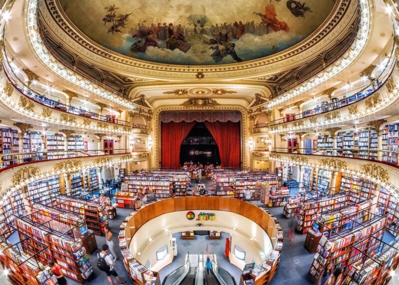 Im Jahr 2000 wurde „El Ateneo Grand Splendid“ schließlich zum Buchtempel. Die heute größte Buchhandlung Südamerikas hat mittlerweile einen Bestand von rund 150.000 Büchern, bis zu 6.000 Besucher*innen kommen täglich hierher. Das liegt nicht nur an der Geschichte und Größe, sondern auch an der Ästhetik des Raumes. 2019 wurde „El Ateneo“ von der Zeitschrift „National Geographic“ zur schönsten Buchhandlung der Welt gekürt.