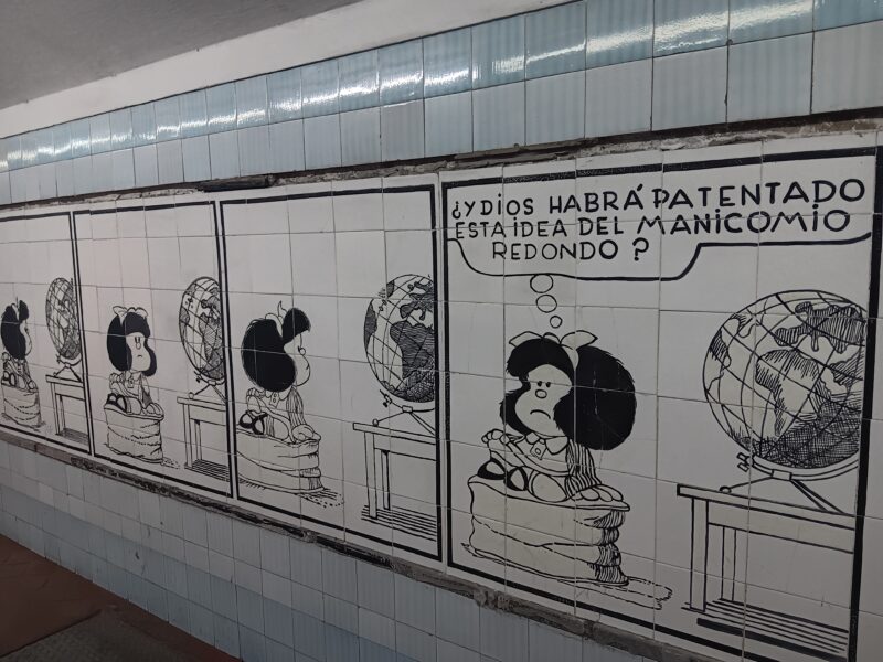 „Was nützt Reichtum im Geldbeutel, wenn Armut im Geist herrscht?” Mit Fragen wie diesen hat sich Mafalda ins kollektive Gedächtnis Argentiniens eingebrannt. Bekannt geworden durch Comicstrips in Tageszeitungen der 1960er Jahre, ist das kleine Mädchen mit den großen Fragen heute eine Ikone der Sozialkritik. Ob auf Wandgemälden, Supermarkttaschen oder Kioskfassaden, in U-Bahn-Passagen oder Auslagen von Buchhandlungen – ihr rundes Gesicht und ihre Schleife in den Haaren sind aus dem Stadtbild von Buenos Aires nicht mehr wegzudenken.